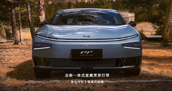 2026款小鹏P7+延续家族运动轿跑姿态,车身尺寸达到5071/1937/1512mm,轴距3000mm,宽体低趴造型搭配流畅大溜背线条,运动气息十足。外观核心升级集中在细节质感:前脸配备1730mm一体式星翼贯穿灯带,支持光剑高亮与示宽灯双模式切换,夜间点亮辨识度拉满;前包围双段式AGS主动格栅可智能开合,兼顾散热效率与空气动力学表现。