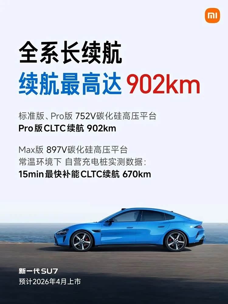 老款SU7最被诟病的就是400V平台,充电慢得像蜗牛。新一代直接“暴力升级”:标准版和Pro版用上752V平台,Max版更是搭载897V高压平台,15分钟补能最高670公里!什么概念?喝一杯星巴克的时间,电量就能从30%充到80%,长途自驾再也不用抢充电桩。续航也彻底告别焦虑:Pro版CLTC续航902公里,实测城市通勤能跑一周;Max版虽然续航稍短(835公里),但双电机四驱+2.7秒破百的性能,妥妥的“性能怪兽”。