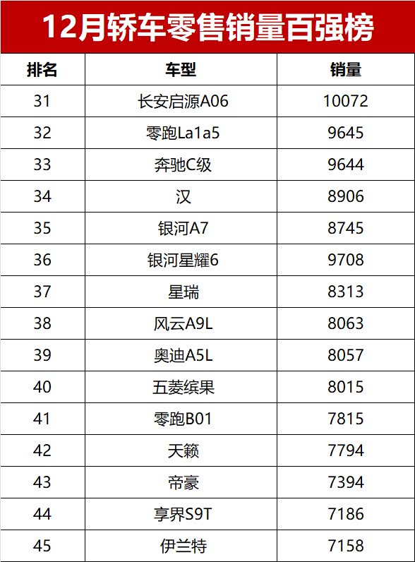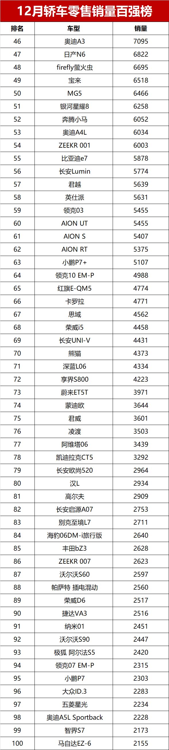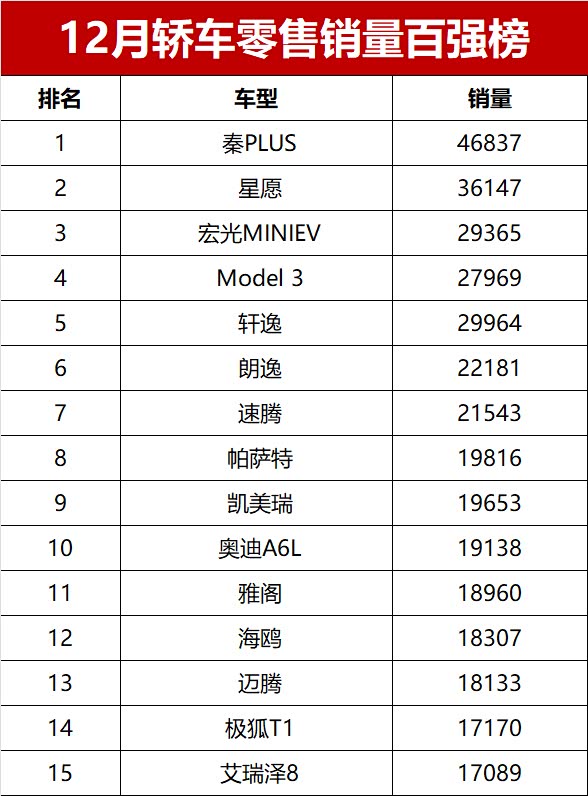 具体来看,12月零售销量破万辆的轿车共有三十一款车型,其中七款车型销量超过2万辆。由于星愿和宏光MINIEV销量下滑,比亚迪秦PLUS以46837辆的销量时隔多月重夺轿车销量冠军;此前一直位居前两位的星愿和宏光MINIEV退居第二和第三位,销量分别为36147辆和29365辆。特斯拉Model 3也有出色表现,以27969辆的销量排名第四位。
