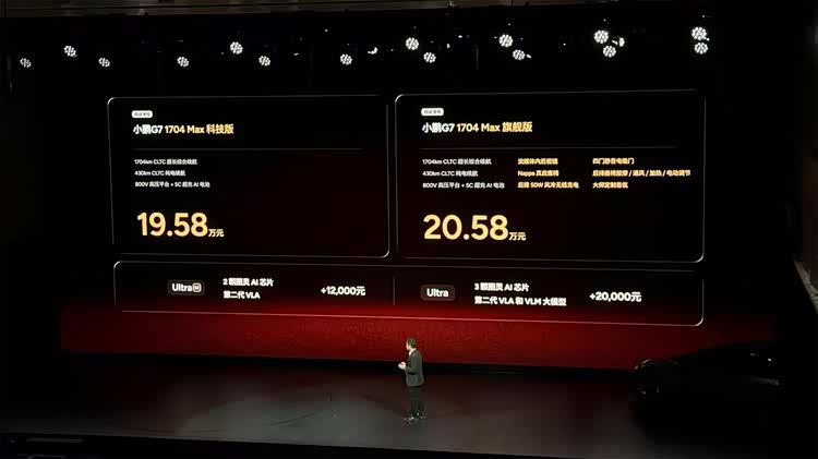 1月8日,小鹏汽车在2026小鹏全球新品发布会上正式官宣了 小鹏G7(参数|询价)超级增程的上市售价,推出2款配置车型,售价区间为19.58-20.58万元。另外,纯电Max旗舰版的售价也进行公布,共有2款配置车型,售价分别为19.58万元和20.58万元,与超级增程的两个配置价格保持一致。