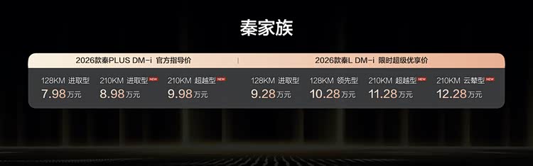 2026年1月8日,家轿市场标杆比亚迪秦家族迎来重磅更新,2026款秦L DM-i 210KM长续航版与2026款秦PLUS DM-i 210KM长续航版双车同步上市,售价区间覆盖8.98-12.28万元。其中秦L DM-i推出限时超级优享价11.28-12.28万元,秦PLUS DM-i则以8.98-9.98万元的定价,首次将200km级纯电续航插混家轿带入8万级区间,两款车型同步奉上丰厚上市权益礼,为消费者带来实打实的购车福利。