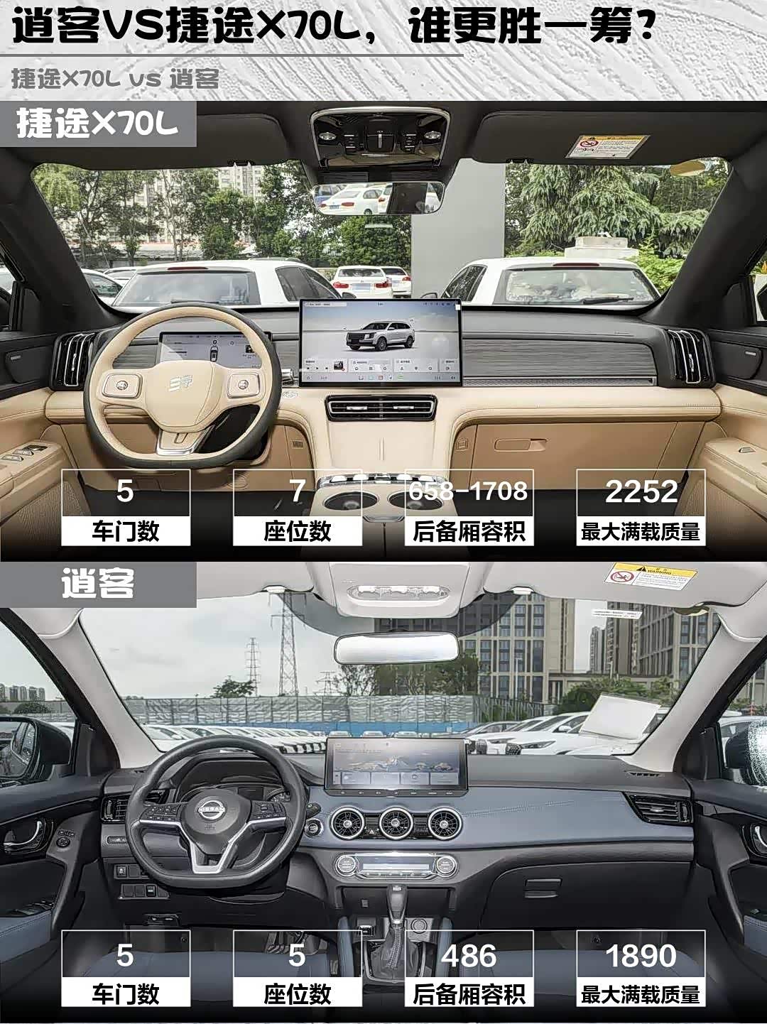 捷途X70L的7座布局太能打!二排一键电动前移,三排860mm腿部空间短途无压力,后备箱放倒直接变身1708L露营神器🏕️。逍客则是标准5座,486L后备箱日常够用,但后排靠背直、地台凸起明显,长途舒适性扣分。