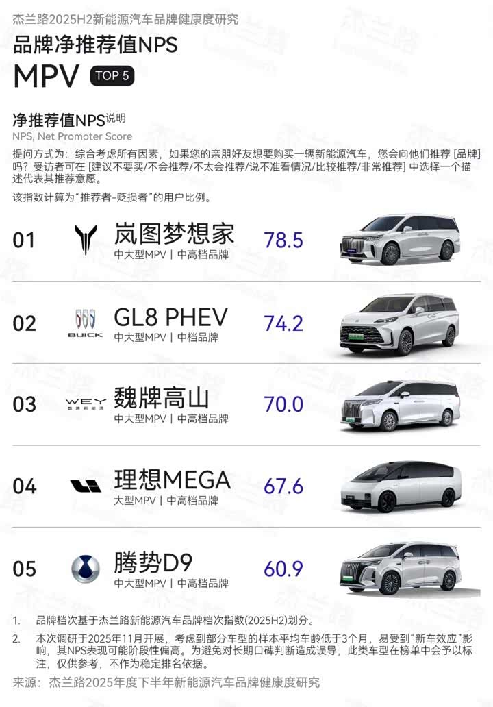 另据杰兰路发布的《2025年度下半年新能源汽车品牌健康度研究(NPS篇)》,岚图梦想家在2025年下半年以78.5分的净推荐值(NPS)位居新能源MPV榜首。