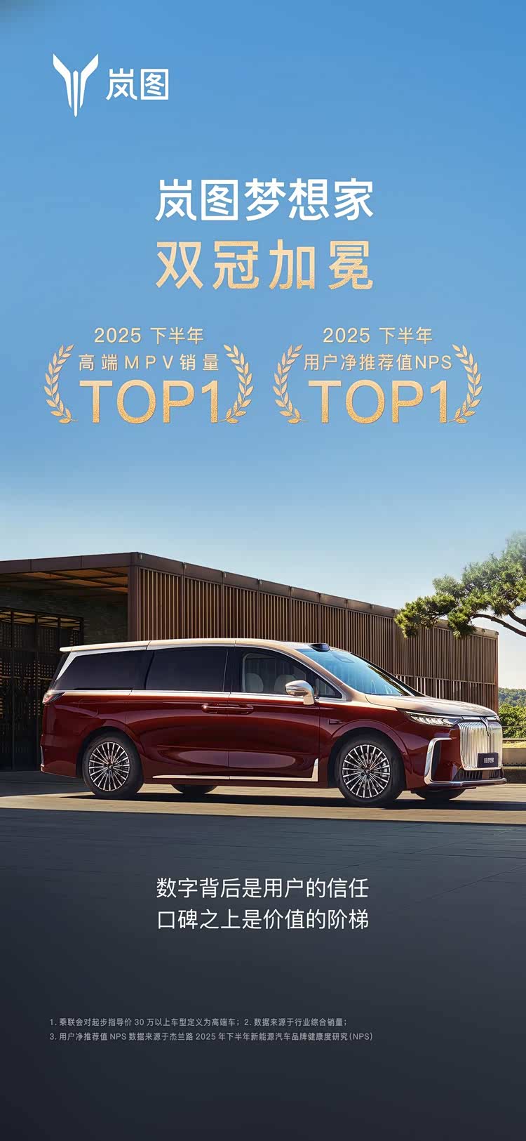 1月10日数据显示,岚图梦想家在2025年下半年销量为43191台,再次蝉联高端MPV第一,2025全年达到80248台,同比增长46%。另据杰兰路发布的《2025年度下半年新能源汽车品牌健康度研究(NPS篇)》,岚图梦想家在2025年下半年以78.5分的净推荐值(NPS)位居新能源MPV榜首。作为豪华旗舰MPV,岚图梦想家在2024年、2025年连续蝉联MPV用户净推荐值第一,成为销量与口碑的“双料冠军”,持续引领中国高端MPV。