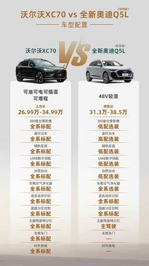 最关键的价格维度,全新XC70的超值属性一目了然。Q5L预售价31.3万-38.5万,其低配31.3万加上3万购置税,总价已能买到全新XC70的顶配车型。要知道全新XC70是绿牌新能源车型,享受购置税全免政策,叠加1月限时1.4万元购置税补贴,再加上置换补贴和灵活金融福利,购车成本大幅降低。而全新XC70限时参考尊享价仅26.99万-34.99万,不仅入门价更低,顶配价格也低于Q5L低配,性价比优势碾压同级。