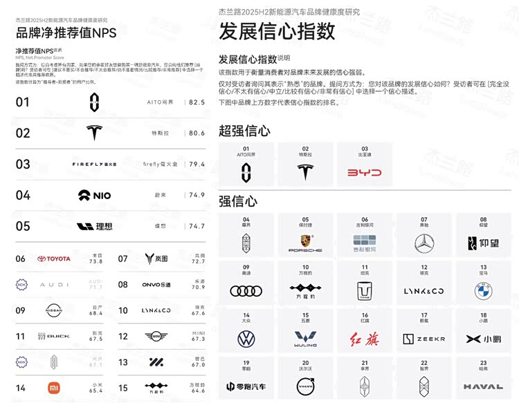 更具风向标意义的,是杰兰路报告的佐证。报告显示,问界已连续三期高居品牌发展信心指数榜首,连续两期获得品牌NPS(净推荐值)第一,同时斩获30万元以上品牌百人青睐指数第一。