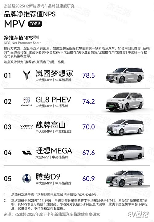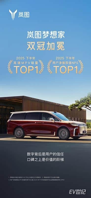 1月10日数据显示,岚图梦想家在2025年下半年销量为43191台,再次蝉联高端MPV第一,2025全年达到80248台,同比增长46%。另据杰兰路发布的《2025年度下半年新能源汽车品牌健康度研究(NPS篇)》,岚图梦想家在2025年下半年以78.5分的净推荐值(NPS)位居新能源MPV榜首。作为豪华旗舰MPV,岚图梦想家在2024年、2025年连续蝉联MPV用户净推荐值第一,成为销量与口碑的“双料冠军”,持续引领中国高端MPV。