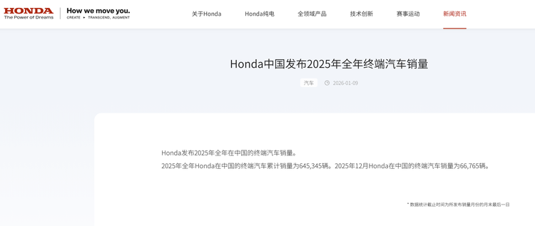 2026年1月9日,本田中国公布了2025年在华销售成绩单。