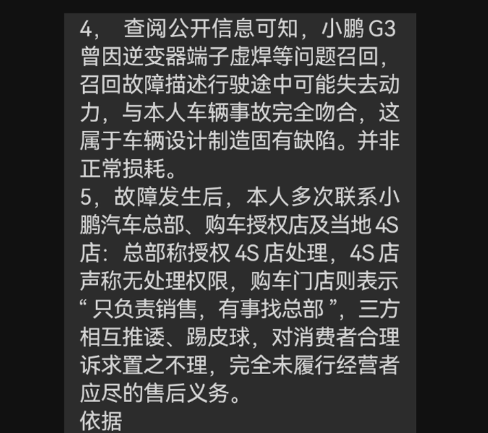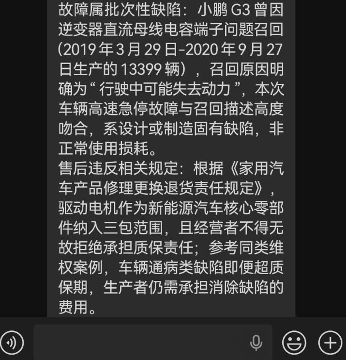 针对该问题,文先生指出,一方面,本次故障属于批次性缺陷,其车辆故障与小鹏G3此前召回的缺陷描述高度吻合,系设计或制造固有缺陷,而非正常使用损耗;另一方面,售后处理违反相关规定,根据《家用汽车产品修理更换退货责任规定》,驱动电机作为新能源汽车核心零部件已纳入三包范围,经营者不得无故拒绝承担质保责任。参考同类维权案例,车辆通病类缺陷即便超出质保期,生产者仍需承担消除缺陷的相关费用。