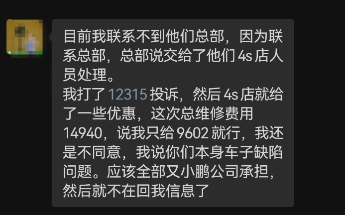 无奈之下,文先生拨打了12315进行投诉。投诉后,4S店向其给出了一项优惠方案,此次车辆总维修费用为14940元,提出让文先生仅支付9602元即可,但文先生明确表示不同意。他认为,车辆故障根源是小鹏汽车的产品缺陷问题,相关维修费用理应全部由小鹏公司承担。然而,在文先生表达这一诉求后,4S店便不再回复其信息,维权事宜陷入停滞。