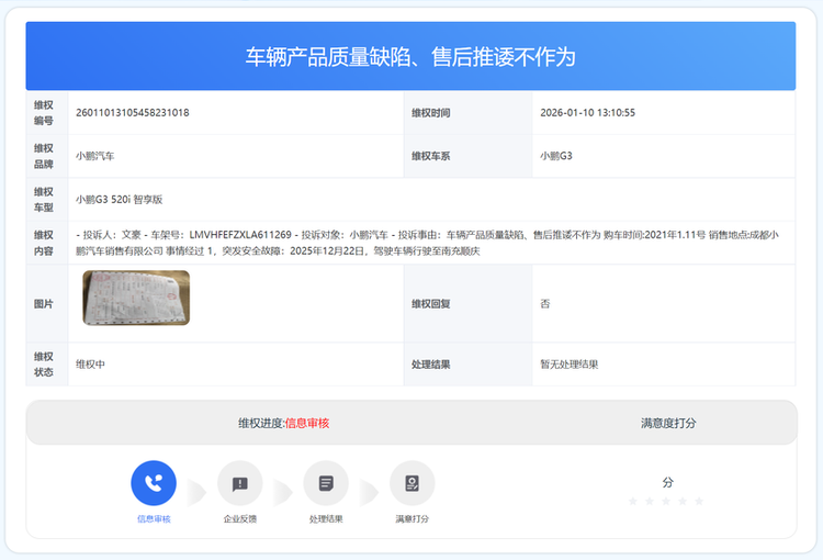 据文先生提供的信息显示,其购车时间为2021年1月11日,销售地点为成都小鹏汽车销售有限公司,此次投诉核心事由为车辆产品质量缺陷及售后推诿不作为。