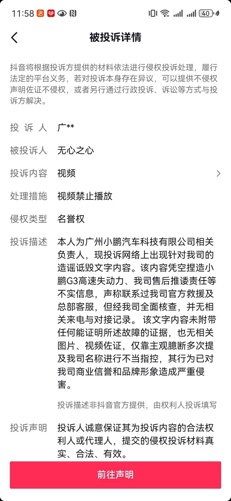 值得一提的是,文先生还提到,其因为发了抖音视频爆光小鹏售后推诿,小鹏方面就举报文先生视频,说文先生凭空捏造小鹏G3高速失动力、我司售后推诿责任等不实信息,声称联系过我司官方救援及总部客服,但经我司全面核查,并无相关来电与对接记录。该文字内容未附带任何能证明所述故障的证据,也无相关图片、视频佐证,仅靠主观臆断多次提及我司名称进行不当指控,其行为已对我司商业信誉和品牌形象造成严重侵害。