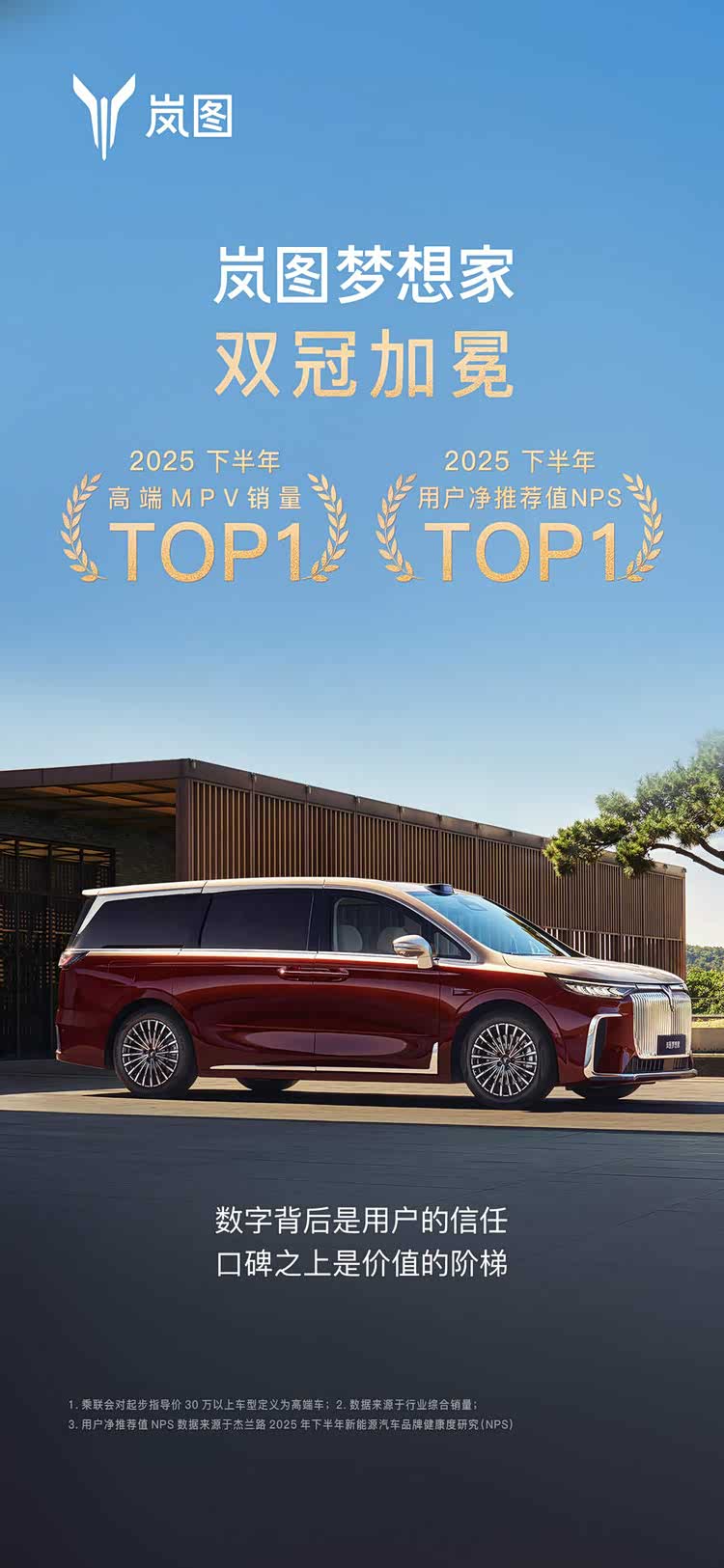 双冠的背后,是两种截然不同的胜利:销量第一,是产品在广阔市场中经受住严苛检验的证明,意味着岚图梦想家已通过市场检验,成为消费者用真金白银投票的成熟产品;NPS第一,则意味着岚图梦想家成为用户心中最值得推荐的新能源MPV,形成了口碑效应与圈层认同,在用户心智中构筑了难以撼动的信任与偏好。两者合一,标志着岚图梦想家完成了从“被选择”到“被推崇”的质变。凭借这双重权威认证,岚图梦想家正在重新系统性定义高端MPV的价值体系和价值标尺。