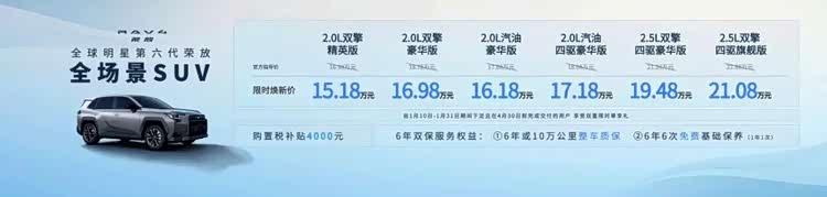 本次大会上,一汽丰田汽车销售有限公司副总经理 窦绘娟女士还发布了SUV家族各主力车型的限时购车政策,优惠直给,力度显著。