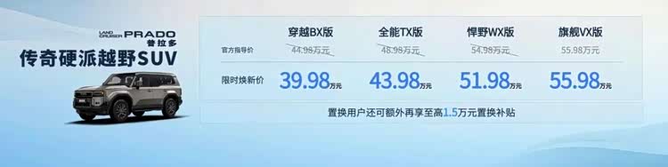 普拉多,作为硬派越野的标杆,官方价格区间为44.98万-55.98万元。此次推出限时焕新价格,穿越BX版起步价打入40万以内,全系焕新价来到39.98万-55.98万区间;置换用户还可额外再享至高1.5万元补贴。
