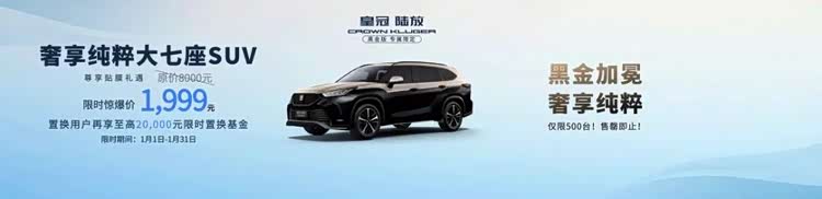 皇冠陆放,对追求高端品质的用户,特别推出黑金版尊享贴膜礼遇。价值8000元的原厂高品质隔热膜,限时专属秒杀价仅1999元,限量前500名订车用户,先到先得,奢华感受再次升级。同时,在1月1日到1月31日期间置换的用户,额外再享至高2万元限时置换基金。