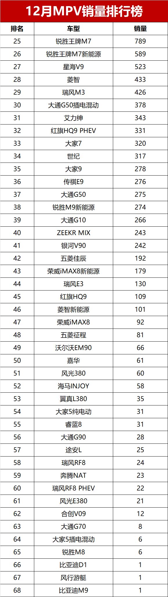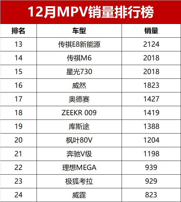 威然、奥德赛、ZEEKR 009、库斯途、枫叶80V、奔驰V级等六款车型销量均达到1000+辆,排名第十六至第二十一位。前几个月销量还不错的理想MEGA,本月销量却只有939辆,仅排名第二十二位。