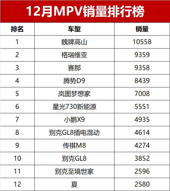 具体来看,12月份零售销量超过3000辆的MPV共有十款车型,其中包括六款新能源车和四款常规燃油车,这十款MPV合计销量达到6.8万辆,占据了MPV市场总销量的将近七成的份额。魏牌高山是唯一一款销量破万辆的MPV车型,以10558辆的销量连续三个月夺冠,成为MPV市场上的新贵。