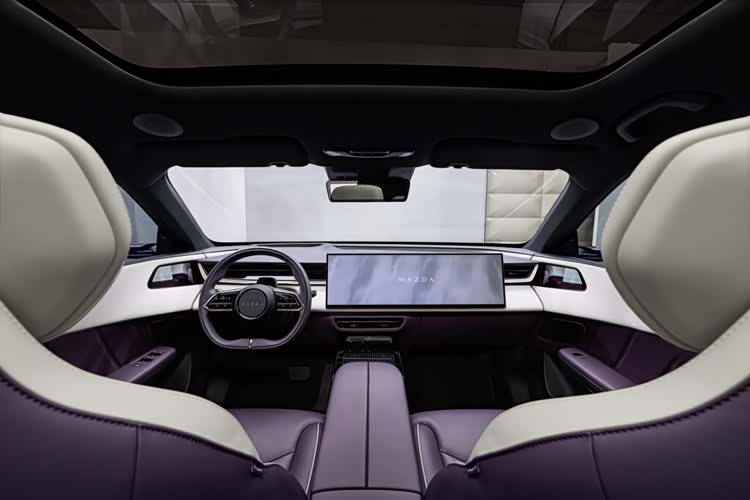 进入车内,CX-6e的内饰设计同样充满了未来感。车内配备了一块巨大的26英寸显示屏,几乎贯穿了整个中控台。此外,车内还配备了抬头显示系统,取消了传统的仪表盘。其他科技配置还包括手势控制快捷键、头枕内置扬声器,以及嵌入门板的电子后视镜显示屏。