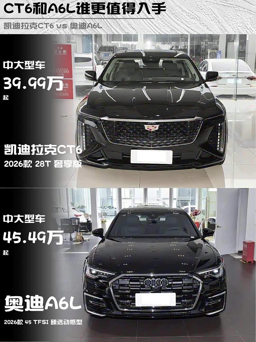 车家号·0浏览·2026-01-11 08:22 · 北京最近后台好多人在问 凯迪拉克CT6(参数|询价)和奥迪A6L怎么选?刚好试驾了2026款CT6 28T奢享版和A6L 45 TFSI臻选动感型,给大家来个硬核对比🔥