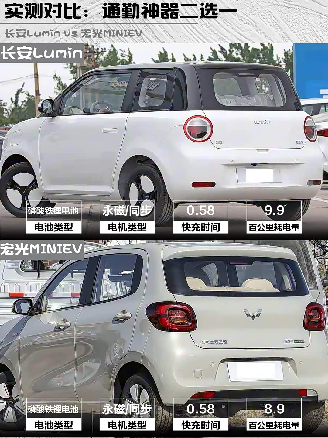 先看硬核数据👉两车CLTC续航都是205km,但实测发现长安Lumin的宁德时代电池更抗造,夏天续航基本1:1,冬天打6折;宏光MINIEV冬季续航会缩到150km左右。充电方面两车都不支持快充,不过长安Lumin的17.65kWh电池比宏光16.2kWh略大,慢充时间要多1小时左右。⚡