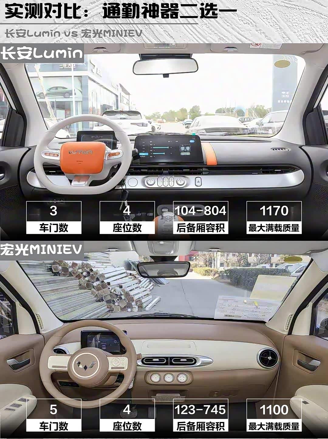 空间实用性上宏光MINIEV四门设计完胜!后排进出不用翻座椅,后备箱123L也比长安Lumin的104L能装。不过长安Lumin前排头部空间更充裕,1米8身高不顶头,门板储物格居然能塞5瓶矿泉水!👔
