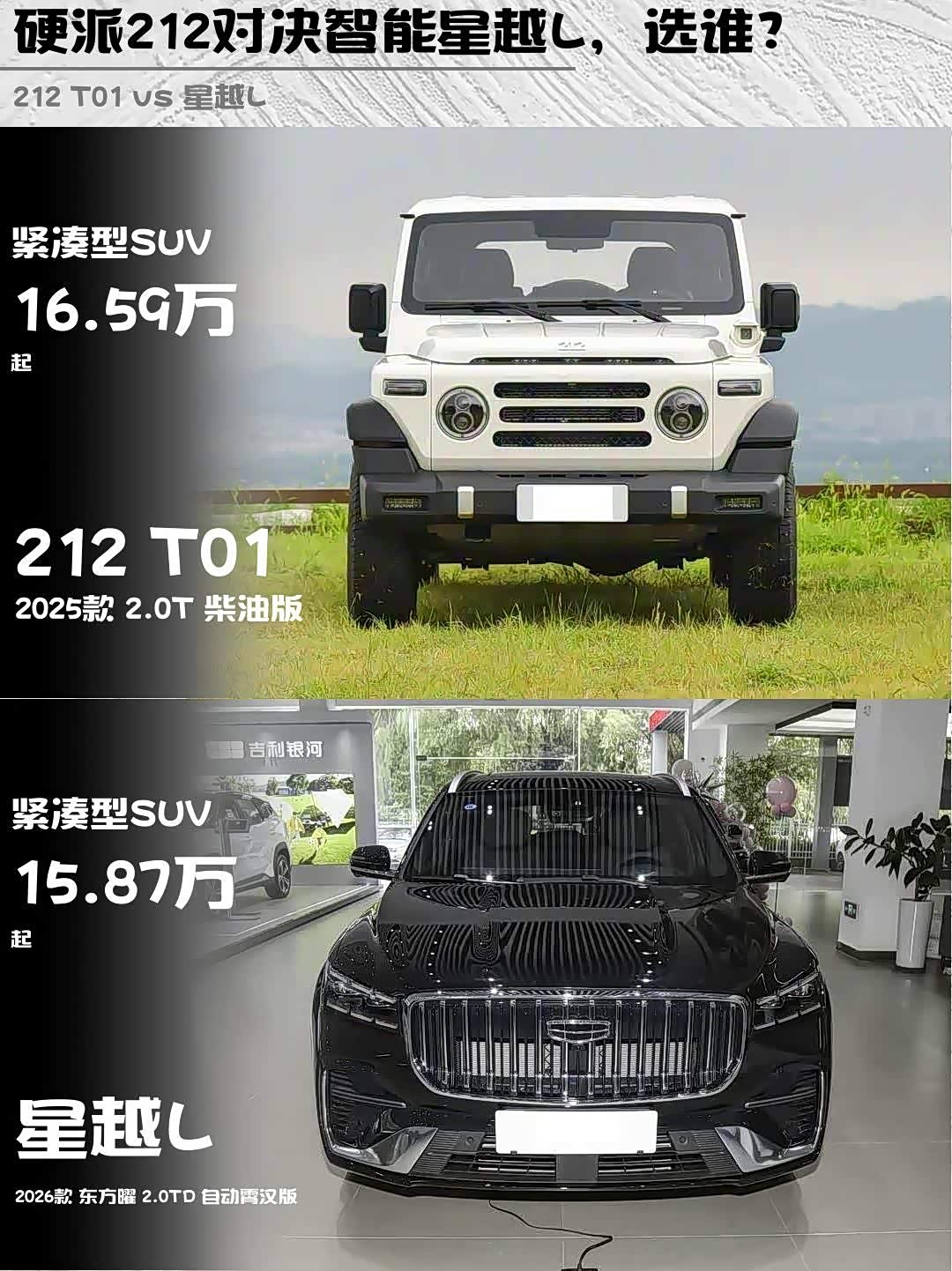 车家号·0浏览·2026-01-11 08:35 · 北京最近被后台疯狂问 212 T01(参数|询价)柴油版和星越L东方曜怎么选,作为深度体验过两台车的野生测评人,今天直接上硬核对比!🔥
