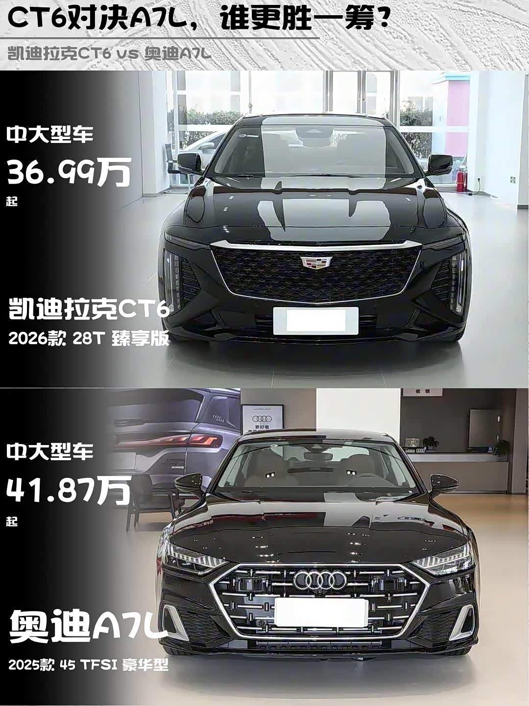 最近后台好多人在问 凯迪拉克CT6(参数|询价)和奥迪A7L怎么选?今天直接拿2026款28T臻享版和2025款45TFSI豪华型来波硬核对比!看完这篇你就知道谁才是真香王👑