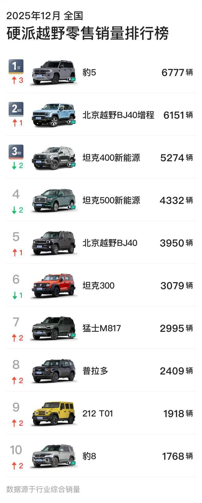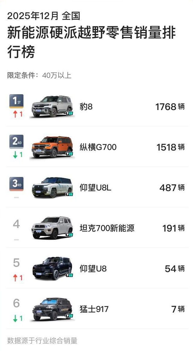豹系列同样表现强劲,“电驱越野开创者”豹5也再度强势卫冕12月硬派越野全品类冠军,巩固其“越野新王”的称号。而“智能硬派开创者”豹8则在40万级以上高端市场持续领跑,获得12月40万级新能源硬派越野冠军,持续引领高端细分市场。