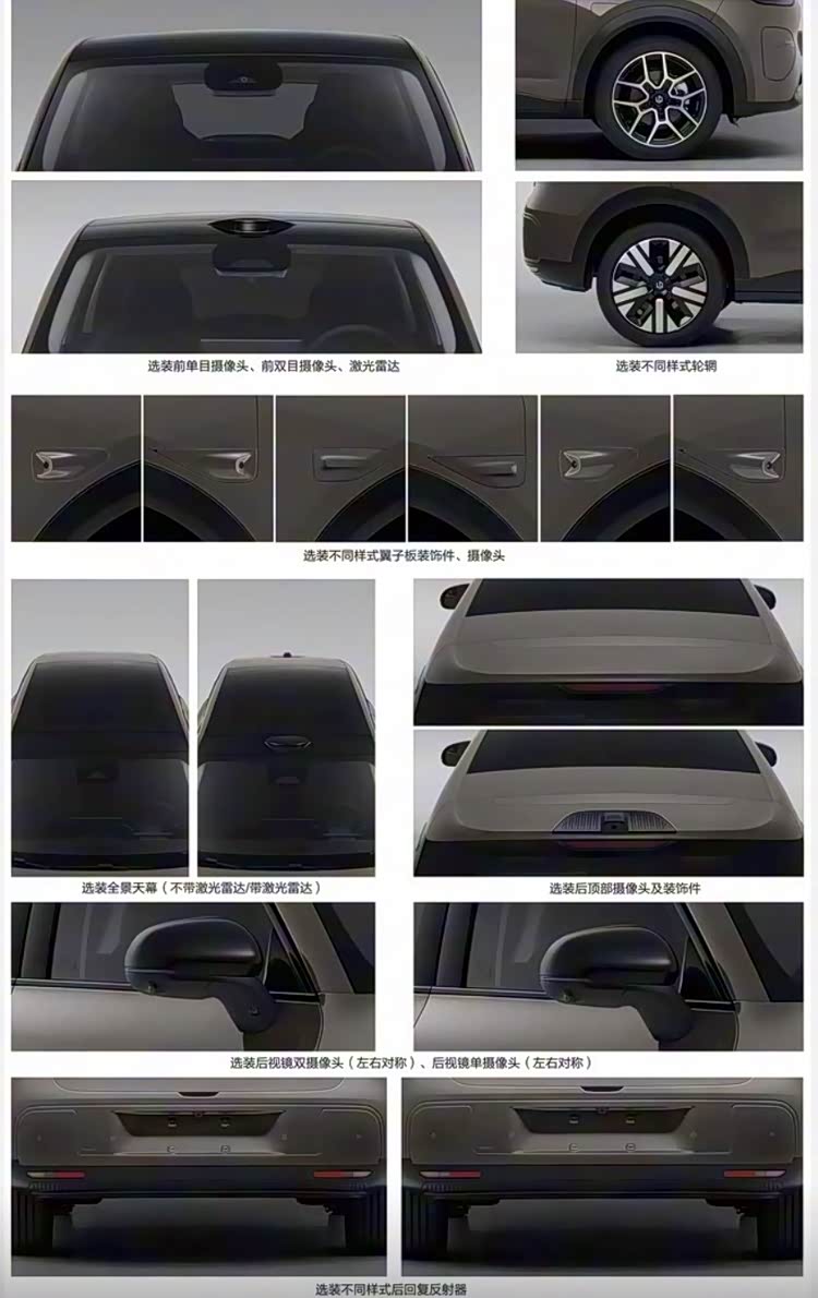 根据曝光的外观申报图来看,新车外观采用“科技自然美学2.0”设计语言,造型简约灵动且辨识度拉满。前脸配备封闭式格栅,搭配笑脸风格的LED大灯组,三段式灯腔结构棱角分明,点亮后极具亲和力,部分车型前脸集成激光雷达装置,为高阶辅助驾驶提供硬件支撑。车身尺寸为4270/1810/1635mm,轴距2605mm,整备质量1360-1460kg,在小型SUV阵营中空间表现出众。