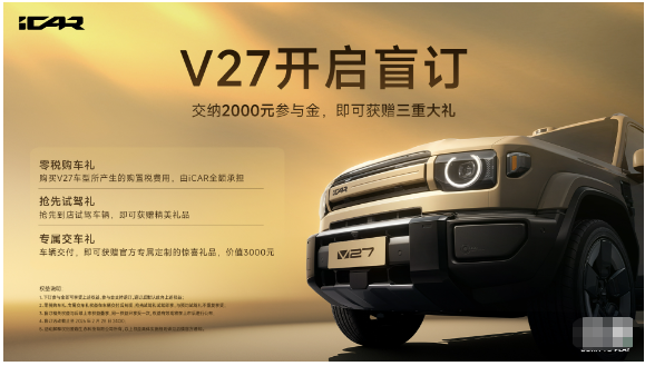 与此同时,V27开启限时盲订,即日起至2月28日,用户支付2000元参与金,即可锁定iCAR全额承担购置税的零税购车礼、抢先试驾礼,以及价值3000元的专属交车礼。