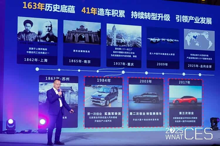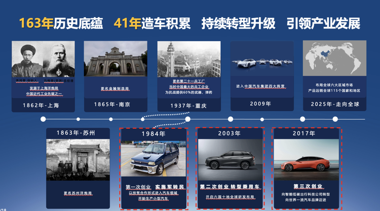 我下面就把长安具体做的事情做一个报告。长安汽车起源于1862年李鸿章在上海创办的上海洋炮局,之后迁至南京江宁制造局,1937年来到重庆,1984年完成军转民,到现在第3000万辆长安汽车已经交付给用户了。我们有全球六大区,79个分子公司。