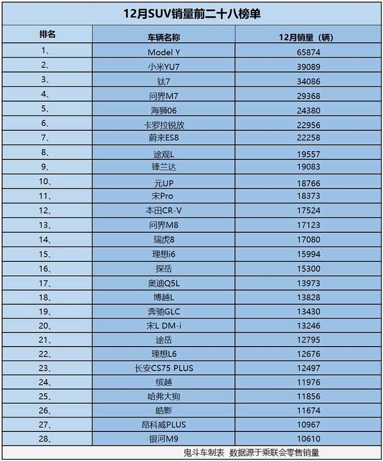 2025年最后一个月的销量榜单正式出炉!在刚刚过去的2025年12月,期待中的完美收尾没有出现,很多品牌销量都出现了下滑,消费疲软的趋势显而易见。