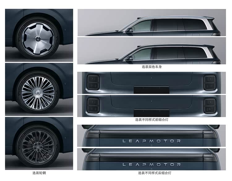 在车身样式上,高配车型“不可避免”地采用双色车身、迈巴赫风格轮毂……虽然落入设计俗套,但用这种“稳妥成熟”的方案来彰显高端的旗舰身份,对于零跑来说是最不会犯错的设计,买大型新能源SUV的高端消费者就是很吃这套“传统设计”。