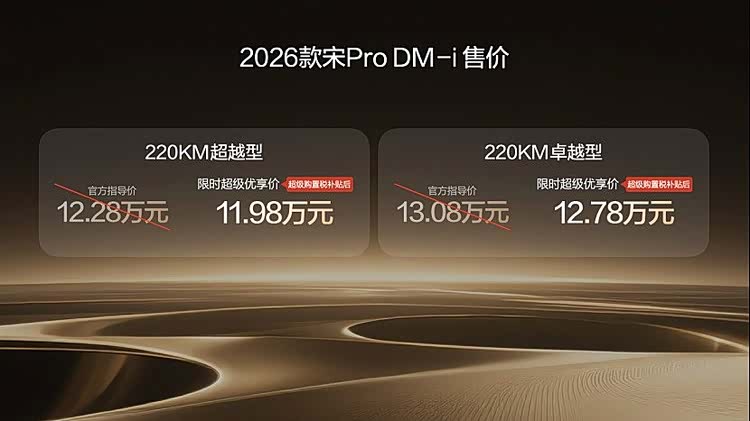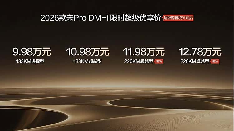 2026年1月10日,比亚迪正式宣布2026款宋Pro DM-i上新220km长续航版本,全系限时超级优享价9.98-12.78万元。