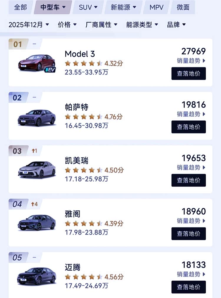 12月份中型车市场销量TOP5名单公布,model 3没有意外的继续排名第一,接近2.8万台,在那么多同价位新能源轿车围攻下,model 3销量依旧断崖式领先,确实很有实力。和燃油中型车相比,国产中型电车的价格更低、底盘用料更扎实、外观好看、内饰更豪华、轴距更长空间更大、高阶辅助驾驶技术更先进等,就算卖不过model 3,按理说怎么也有两三款车型进入TOP5吧,万万没想到居然一款都没有上榜。