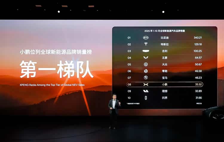 发布会上印象深刻的一点是,何小鹏好几次跳出企业立场,从整个中国智能电动车分析全球竞争局势。比如开场不久亮出一份“2025年1-10月全球新能源汽车品牌销量”,小鹏排名第8,他强调,重要的是前10中有7家中国品牌。