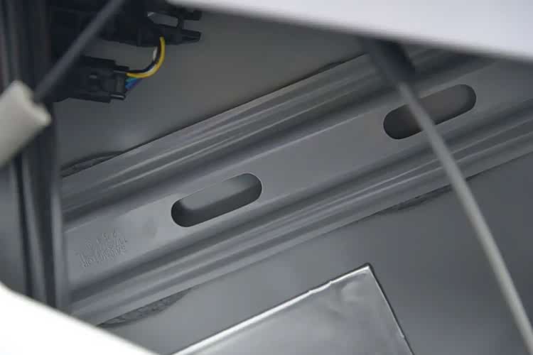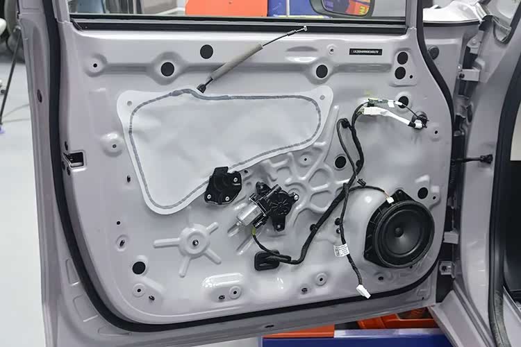 拆掉车门内饰板,看到内部采用大面积金属板,只留有检修口,使用传统的塑料膜进行防水密封,这种结构自然不会有辅助气囊更快更准弹出的门压传感器。