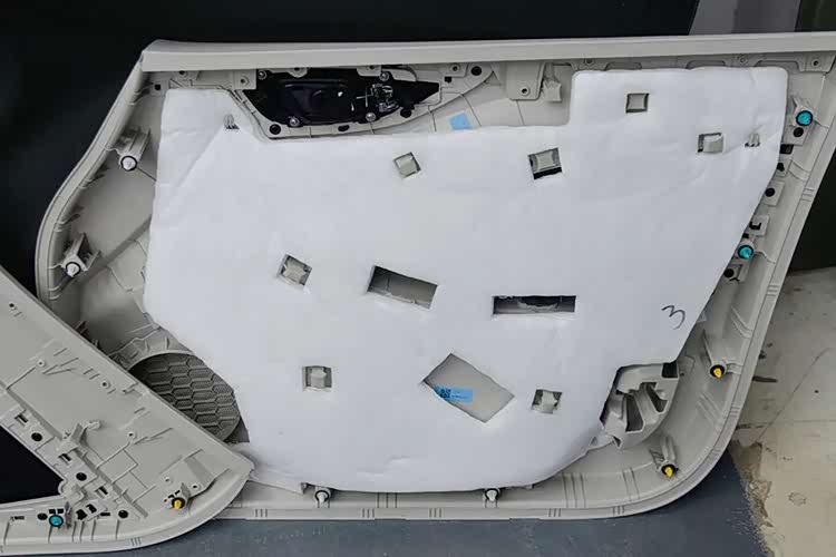 前门内饰板贴有大面积白色原生隔音棉,而后门却空空如也。