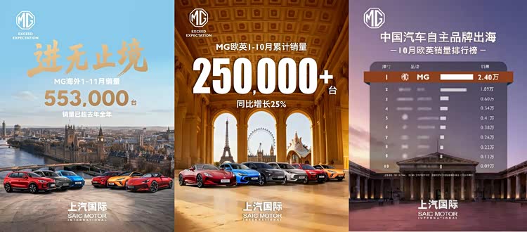 而在海外市场,MG的稳健表现成为2025品牌转折的重要延伸。2025年1-11 月,海外销量破55万,其中欧英市场表现尤为突出,截至2025年12月20日销量破30万,成为中国车企海外首个30万辆级单一市场。