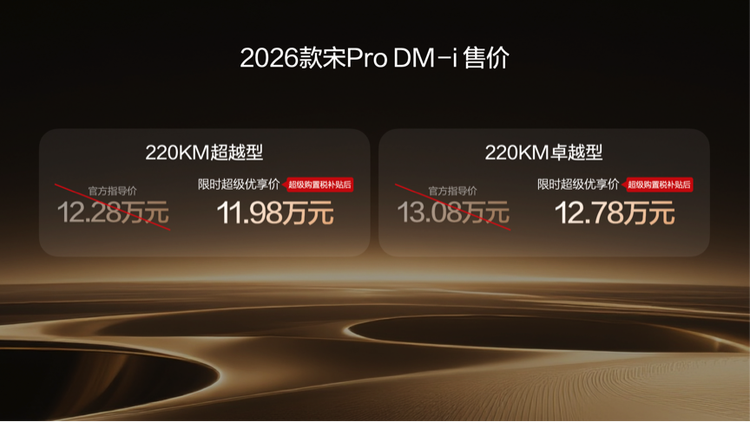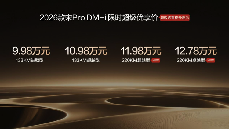 2026年1月10日,比亚迪正式宣布2026款宋Pro DM-i上新220km长续航版本,全系限时超级优享价9.98-12.78万元。