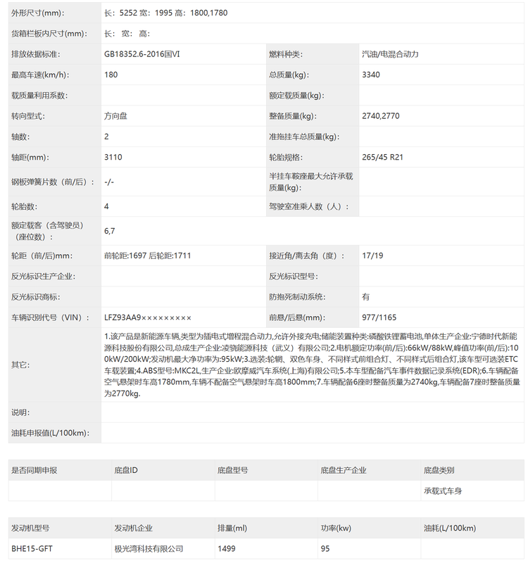 纯电车型采用了1000V高压平台打造,最高提供三电机,综合最大功率540kW,零百加速在3秒级别,电池组容量115kWh,CLTC工况续航720km,充电15分钟可补充350公里以上的续航里程。不过这次申报的是双电机低配版本,前电机最大功率180kW,后电机最大功率230kW,搭配的是磷酸铁锂+三元锂电池。