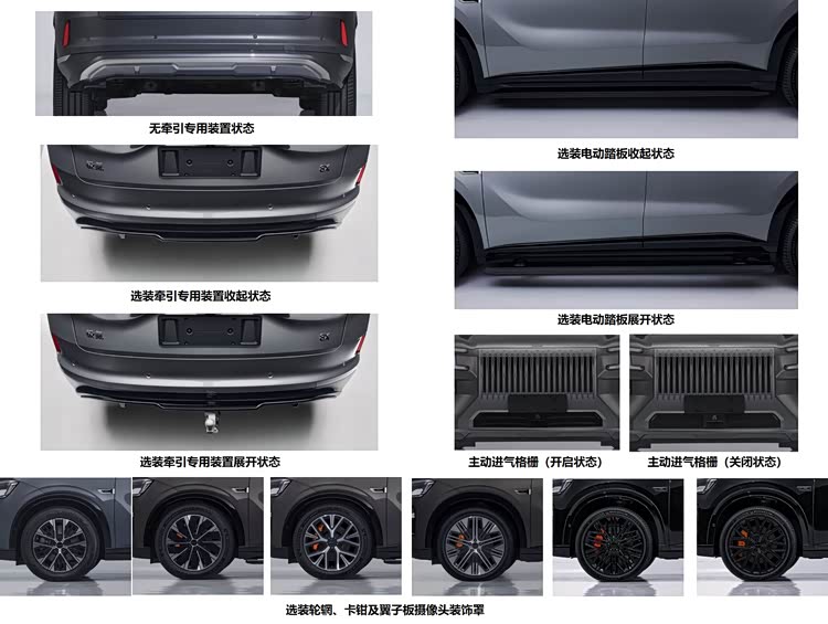 配置方面,新车能够选装拖车钩、流媒体后视镜、电动踏板以及多种造型的轮毂等等,选装配置非常丰富。
