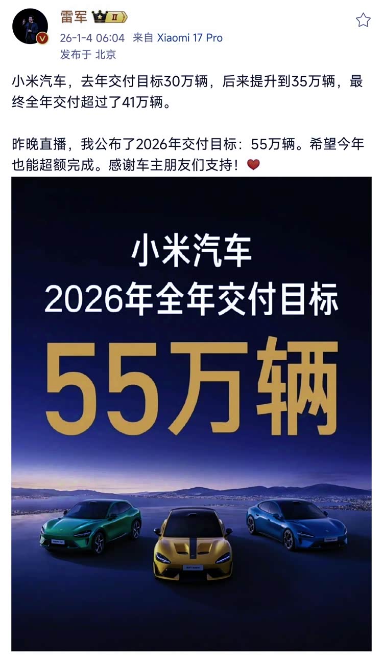 各大车企纷纷公布2025年累计销量,其中多家车企完成了目标销量,比如比亚迪小米零跑小鹏等,现在小米零跑蔚来已经公布2026年的目标,其中雷军说2025年的目标销量本来是30万台,后来提升到35万台,最终以41万台销量超额完成目标,2026年的汽车销量目标是55万台,雷军表示希望能再次超额完成这个目标。