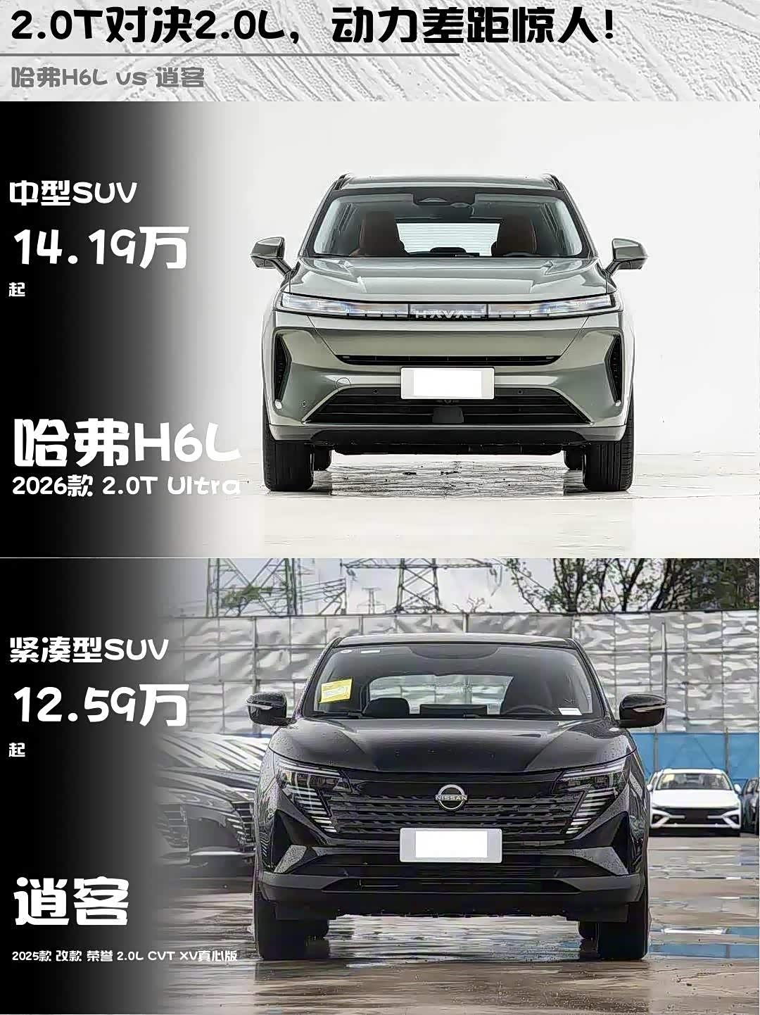 最近在选车的小伙伴看过来!今天给大家深度对比两款热门SUV—— 哈弗H6L(参数|询价) 2026款 2.0T Ultra和逍客2025款改款荣誉2.0L CVT XV真心版,实测干货直接上菜!🔥