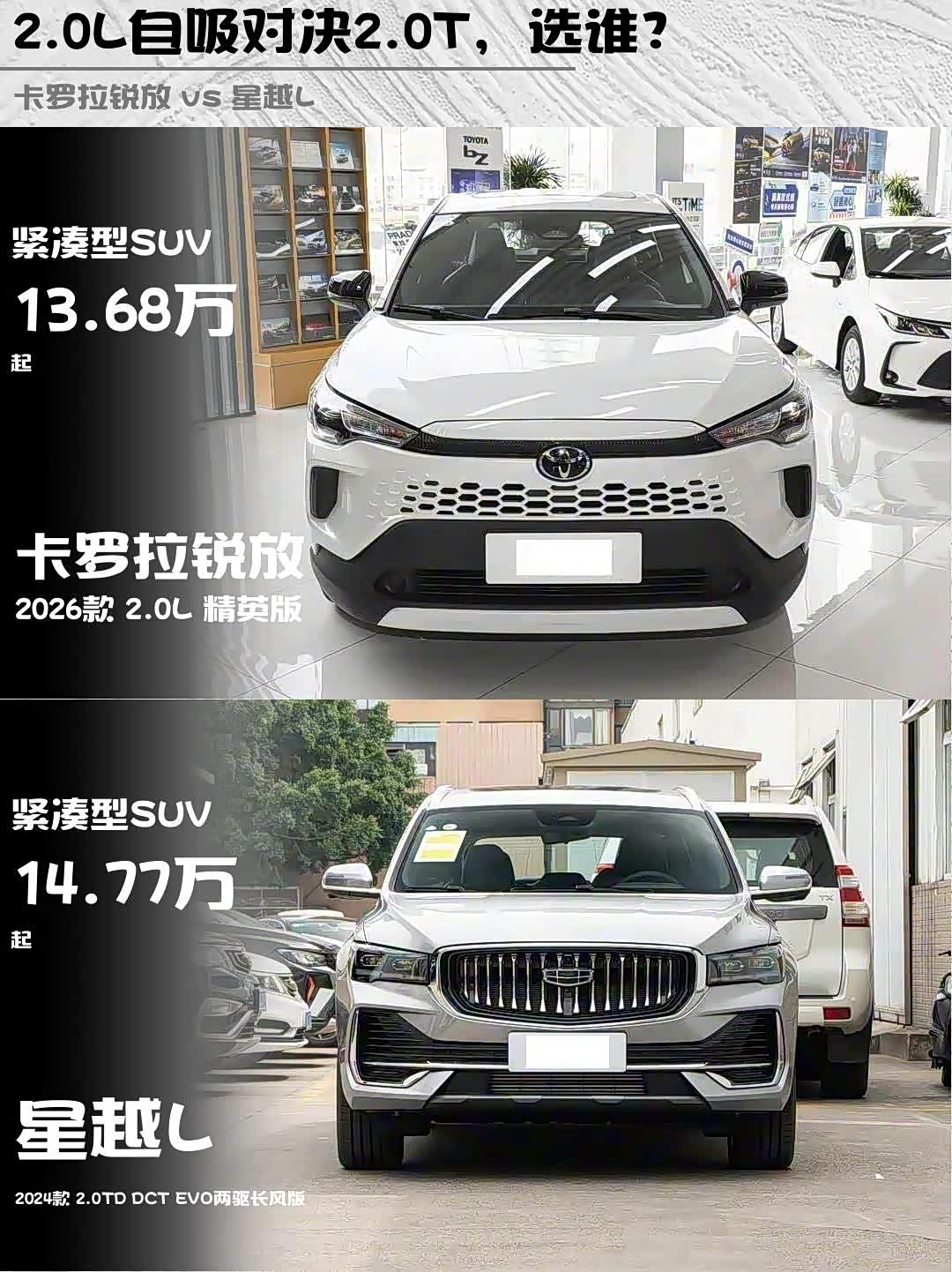 车家号·0浏览·2026-01-12 08:36 · 北京最近在15万级SUV市场纠结到爆!😵💫 卡罗拉锐放(参数|询价)2026款2.0L精英版和星越L2024款2.0TD两驱长风版到底怎么选?实测对比干货送上👇