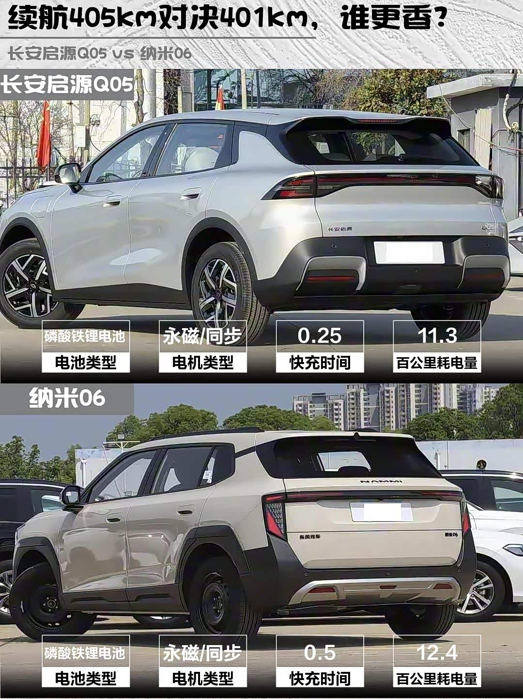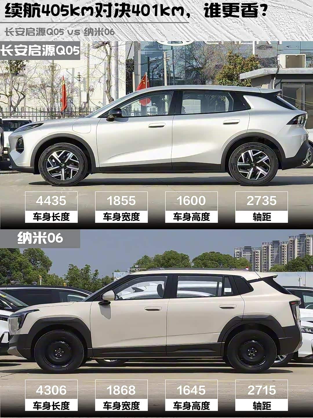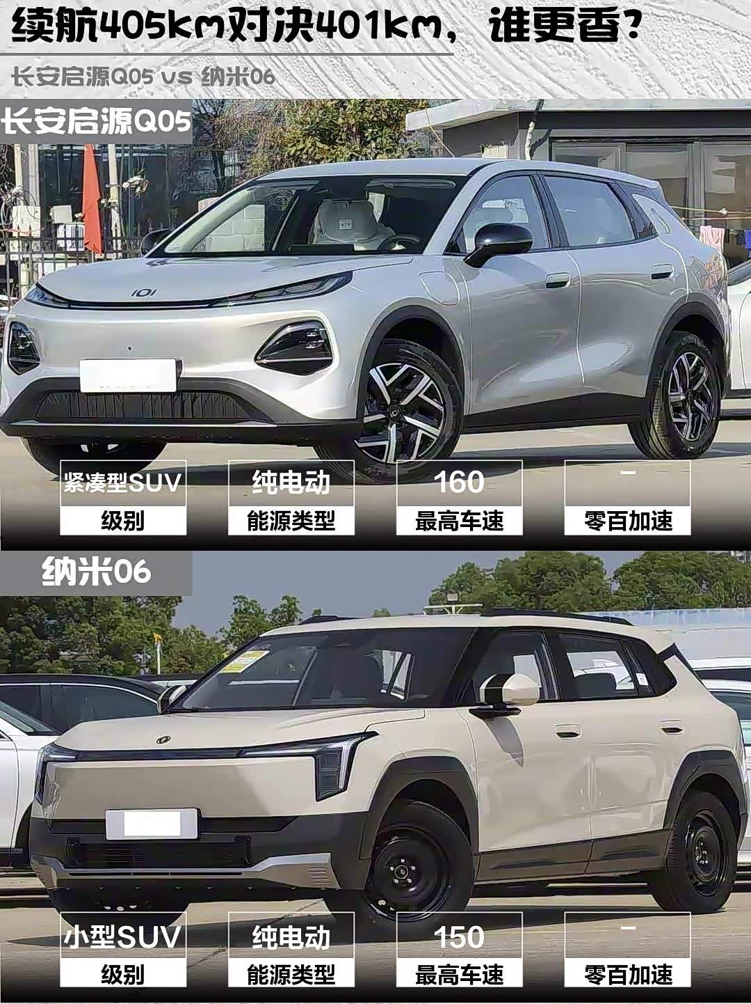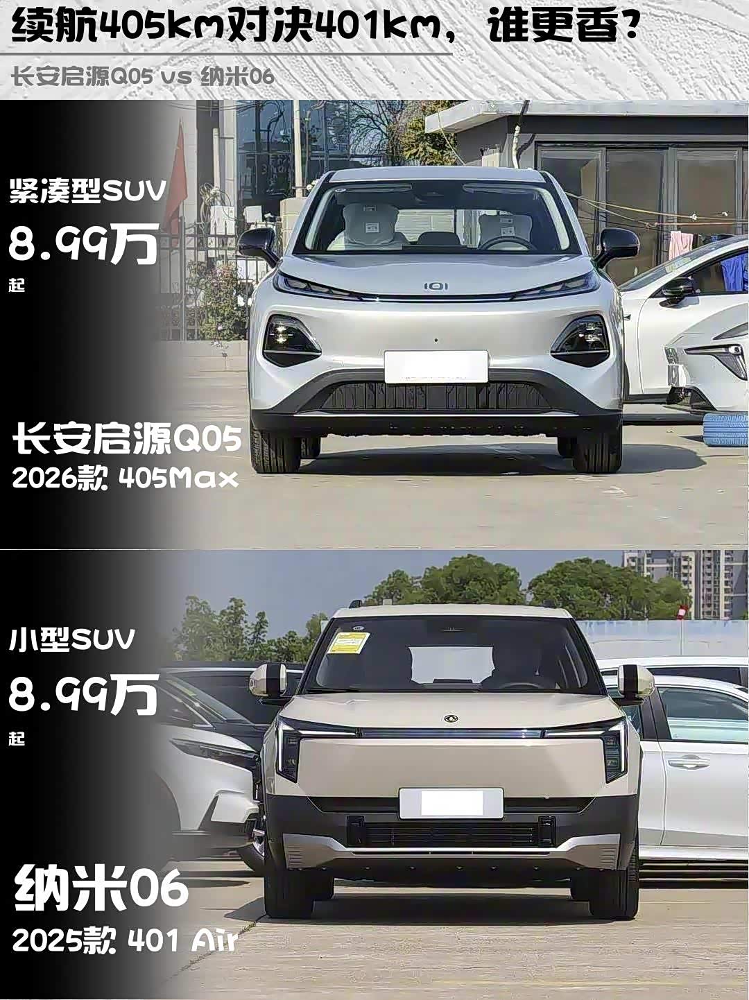 最近在10万级纯电SUV市场纠结了好久,最终锁定了两款热门选手—— 长安启源Q05(参数|询价) 2026款 405Max和纳米06 2025款 401 Air。两款车指导价都是8.99万,但实际体验差异还挺大,给兄弟们做个深度对比🆚