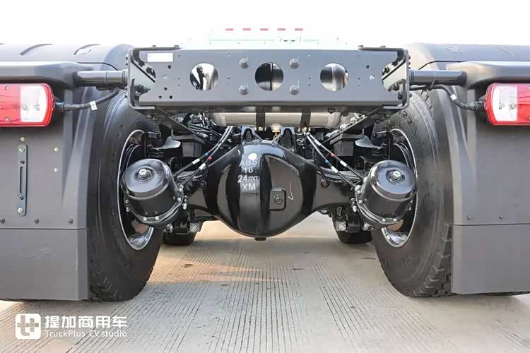 车辆采用6X4驱动形式,车桥是汉马科技最新的一体铸造桥壳单级减速桥,相比于传统冲焊桥轻量化效果要好一些,并且还配备了轴间差速锁和桥间差速锁。全车前2后3片钢板弹簧悬挂,12R22.5成山高层级轮胎,珀然铝合金轮毂,底盘方面实现承载与轻量化并进的效果。