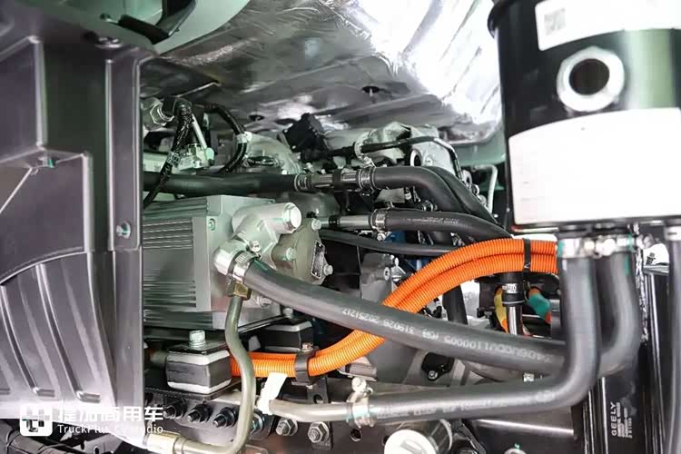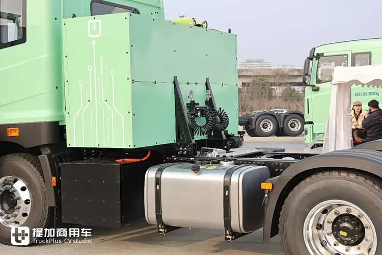 车辆有纯电优先、智能电混、智能强混三种模式,通过驾驶室内的按键即可调节。在纯电模式下,车辆的续航里程大概为330km,然后满醇满电情况下综合续航超1000公里,是同等电量纯电车型3倍续航,可满足当前电动重卡难以解决的70%场景需求,相当于“随车自带充电桩”,彻底摆脱充电桩依赖,拓宽新能源重卡的运营半径。