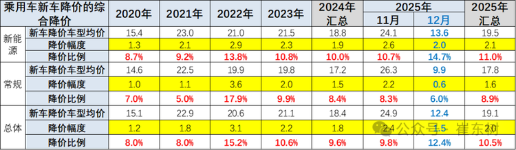 2025年被称为“反内卷”之年,但年末车市依旧溅起了价格战的“浪花”。乘联分会秘书长崔东树提供的数据显示,2025年12月,新能源车降价车型均价为13.6万元,平均降价2万元,降幅高达14.7%。受新能源车降价拖累,12月乘用车市场总体新车降价车型均价12.4万元,算术平均降价力度达到1.5万元,降幅达12.4%。
